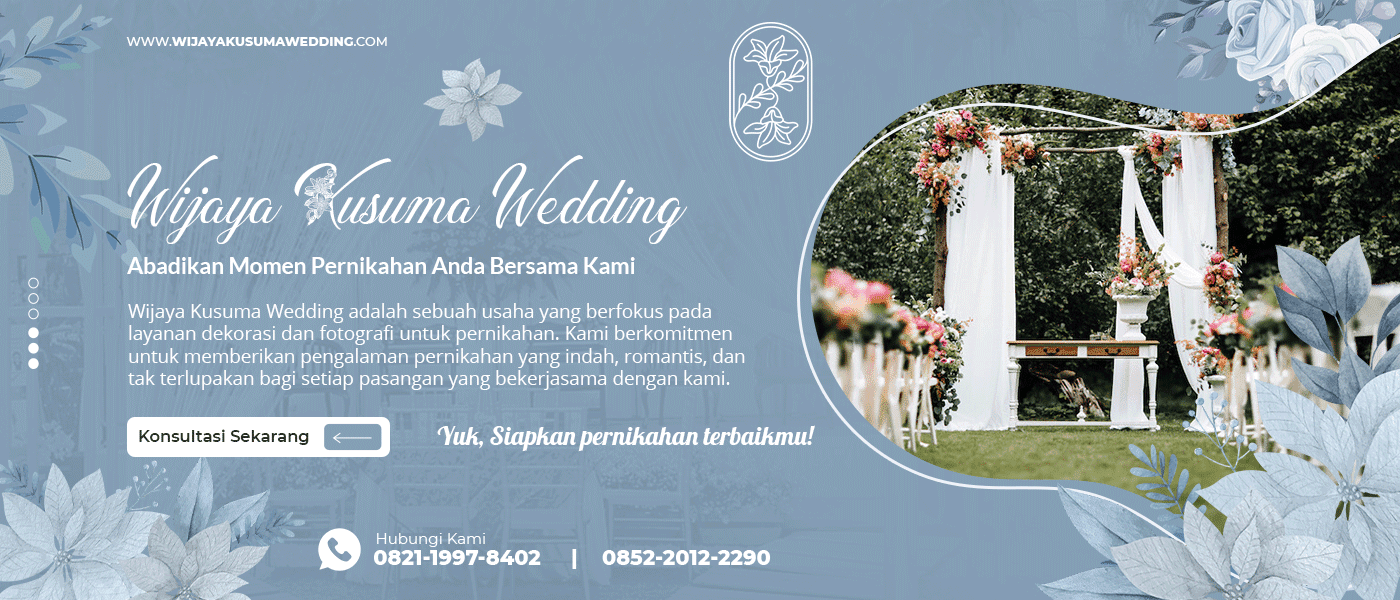 Wijaya Kusuma Wedding adalah sebuah usaha yang berfokus pada layanan dekorasi dan fotografi untuk pernikahan. Kami berkomitmen untuk memberikan pengalaman pernikahan yang indah, romantis, dan tak terlupakan bagi setiap pasangan yang bekerjasama dengan kami. Dengan sentuhan kreatifitas dan profesionalisme, kami bertekad untuk menjadikan momen pernikahan Anda menjadi sangat istimewa.